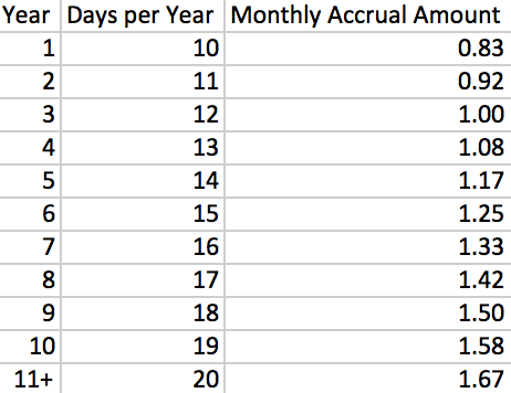 Regular full-time employees are eligible to accrue vacation time. Vacation accrues on the 1st of each month (see attached chart for the monthly accrual rate). For employees starting before or on the 20th of the month, accrual begins immediately. For those starting the 21st or after, accrual begins on the 1st of the following month. The minimum portion of a day that can be taken is one quarter. At each anniversary the accrual rate increases until it maxes out at 1.67 days per month.